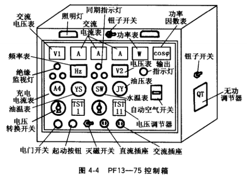 為了滿足發(fā)電機(jī)組的并聯(lián)運(yùn)行和監(jiān)測內(nèi)燃機(jī)的運(yùn)行情況,有的控制箱還設(shè)置有調(diào)差 裝置、燈光同步指示器、同步電壓表、水溫表開關(guān)、起動按鈕等,如圖4-4所示。