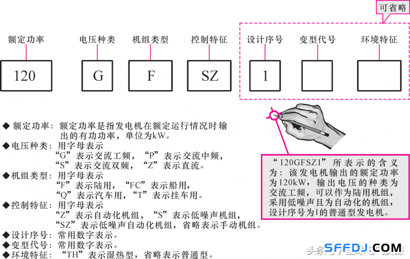 發電機的型號通常是對機組的型號進行的說明,其中包含的信息有發電機輸出的電壓的種類、發電機機組的類型、控制特征、設計序號以及環境特征等,如圖5所示。