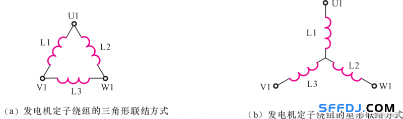 發電機的定子接法主要可以分為兩種,即三角形(△形)聯結和星形(Y形)聯結,如圖9所示。在發電機中,通常發電機定子的3個繞組一般都聯結成星形。