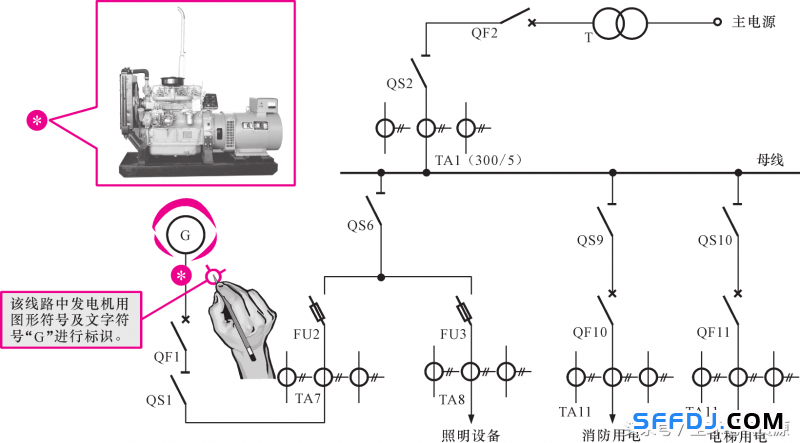 從圖10中可以看到,發電機的符號與電動機符號相似,一般用字母“G”文字符號標識。其中G表示發電機,GD表示直流發電機,GA表示交流發電機(異步發電機),GS表示同步發電機,GH表示永磁發電機。根據這些不同的字母標識,可以快速識別出該線路中使用的發電機的類型。