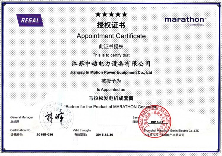 上海馬拉松革新電氣有限公司授權(quán)江蘇中動(dòng)電力設(shè)備有限公司作為發(fā)電機(jī)配套商